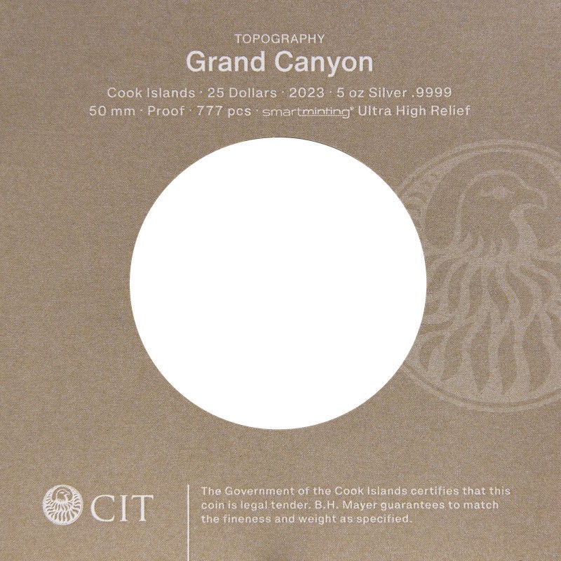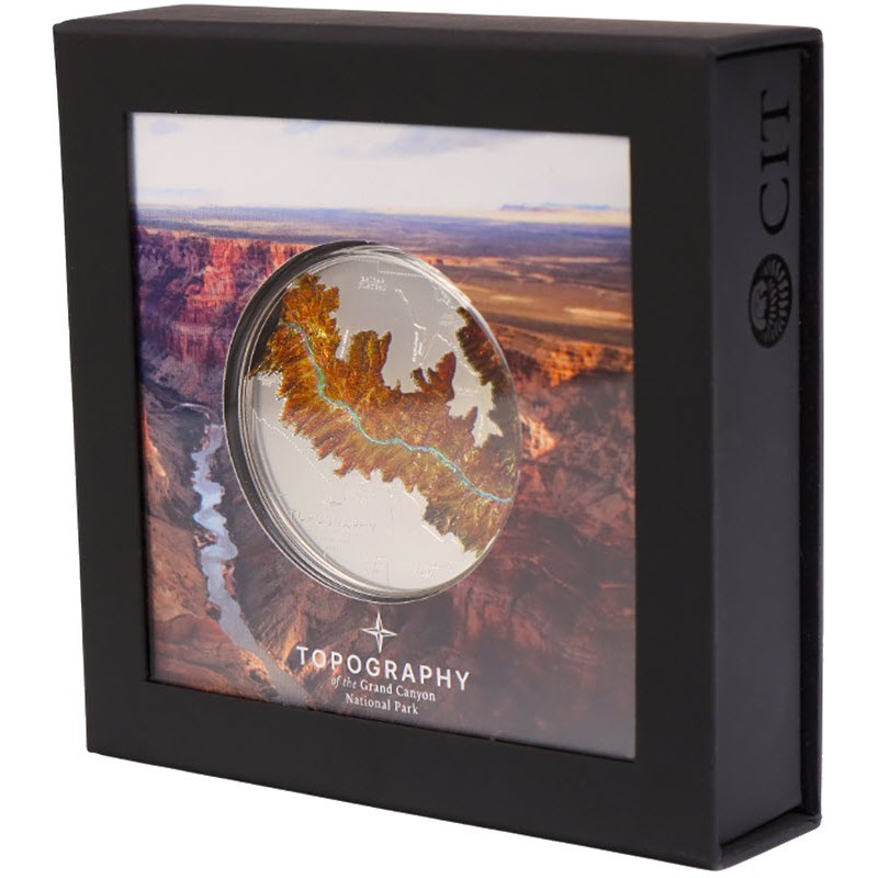 На реверсе монеты изображены удивительные сверхвысокие рельефы, выполненные с помощью технологии Smartminting, изображающие Гранд-Каньон, массивное геологическое образование, простирающееся на более чем 277 миль в северной Аризоне. Техника чеканки, кажется, воссоздает эффект Большого Каньона, высеченного в скалах.