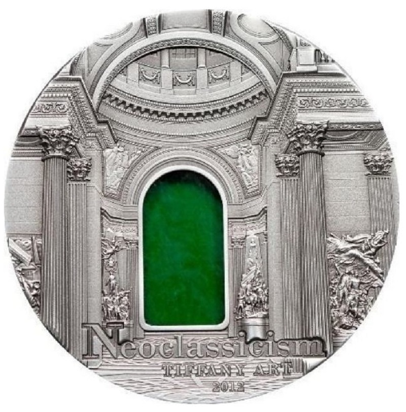 Серебряная монета из роскошной серии «Тиффани Арт», посвященной важнейшим стилям архитектуры мира. Монета выполнена в античном стиле и украшена цветным стеклом. Поставляется в футляре с сертификатом подлинности.