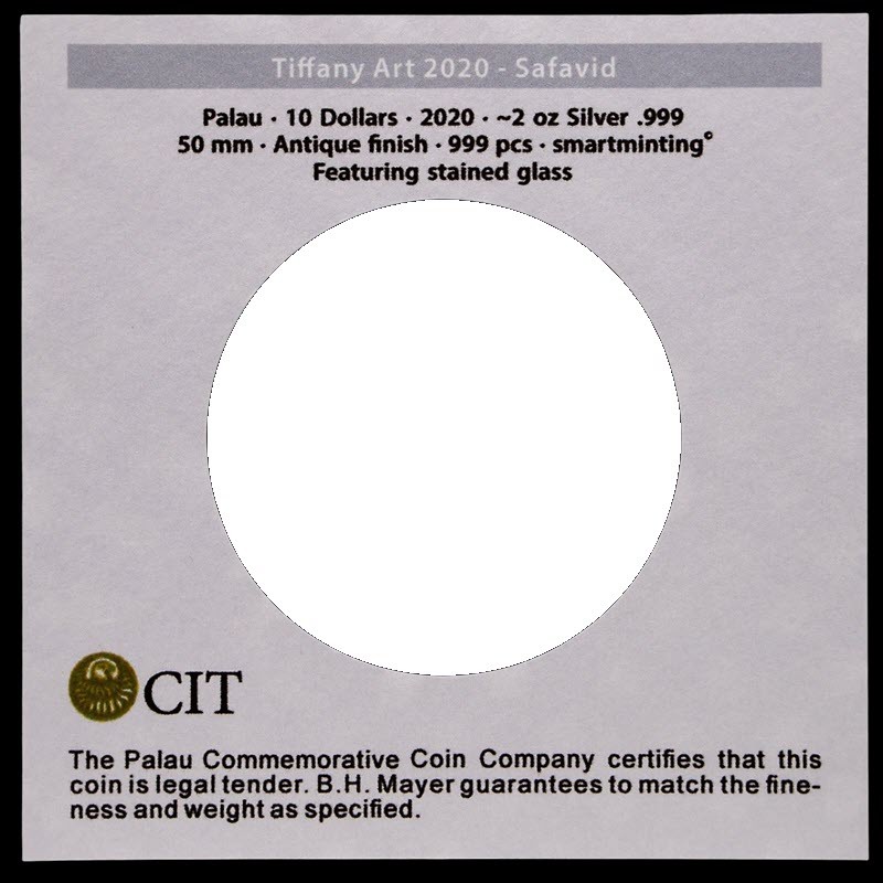 На реверсе изображена наружная часть мечети шейха Лотфоллы со вставкой из стекла Тиффани, имитирующая главный вход в мечеть. Вверху надпись: safavid (Сефевиды), внизу: Tiffany Art 2020 Final Edition (серия, год чеканки, последний выпуск серии).