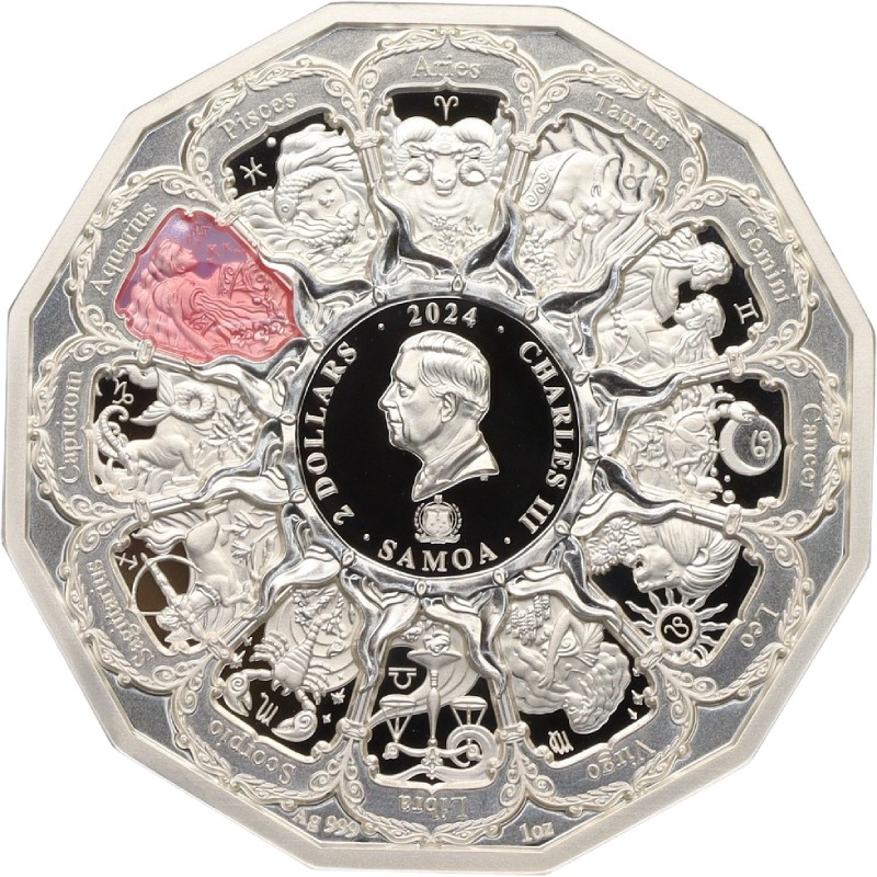 На реверсе монеты изображена круговая композиция из 12 знаков зодиака, каждый из которых заключен в отдельный орнаментальный медальон с соответствующим символом и изображением, а также названием на латинском языке. Знак зодиака Водолей выделен цветной полупрозрачной эмалью, потому что архангел Уриил покровительствует этому знаку зодиака. В центре расположен портрет Его Величества Карла III, дизайнера Глина Дэвиса (GD). Под ним - герб Самоа. Вокруг портрета по кругу надписи: SAMOA ∙ 2 DOLLARS ∙ 2024 ∙ CHARLES III (страна-эмитент, номинал, год чеканки, Чарльз III). Внизу вдоль канта – Ag 999 1oz (проба и вес серебра).