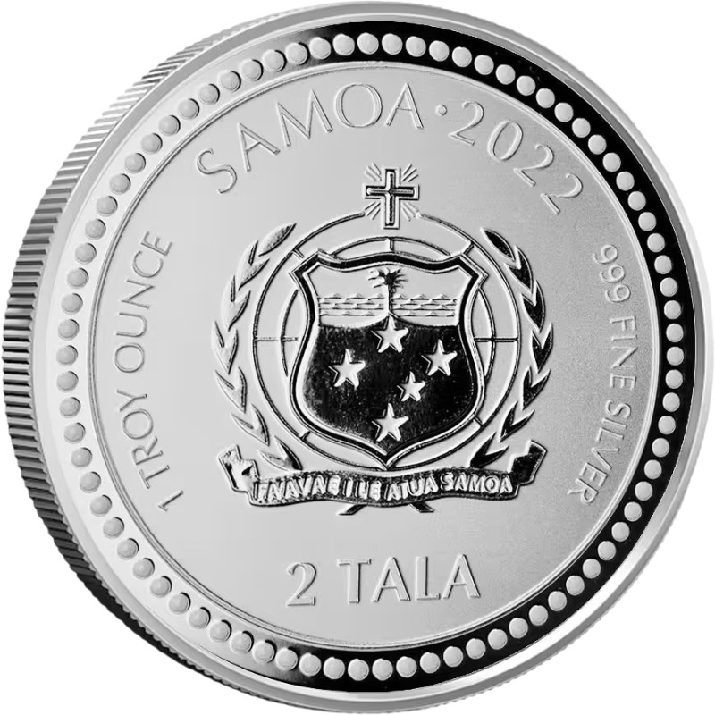В центре изображен герб Самоа. Надпись на ленте: Fa'avae I Le Atua Samoa (Бог да будет Основой Самоа). Вверху вдоль канта надписи: 1 TROY OUNCE SAMOA ∙ 2022 999 FINE SILVER (вес серебра, страна-эмитент, год чеканки, проба серебра). Внизу: 2 TALA (номинал).