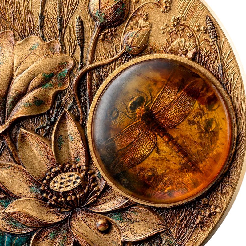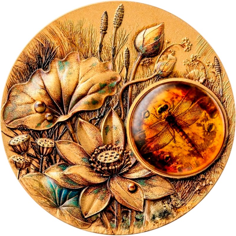 На реверсе монеты изображена изящная стрекоза, деликатно сохраненная внутри янтарной вставки. Тонко детализированные крылья и тело насекомого кажутся окаменевшими в движении. Фон монеты – сложная ботаническая композиция из цветов, семян и трав, выполненных в высоком рельефе.