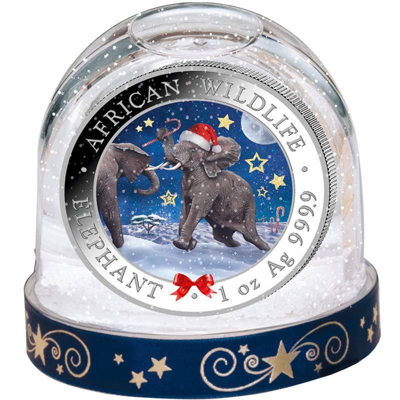 Эта удивительная серебряная рождественская монета Сомали 2024 года выпуска. Она выпускается в рамках серии "Африканская дикая природа". У нее упаковка в виде снежного шара, в котором монета установлена вертикально, поэтому вы можете видеть дизайн как аверса, так и реверса. Она надежно удерживается в центре, поэтому вы можете встряхнуть шар, чтобы создать зимнюю сцену вокруг неë. Поставляется с сертификатом подлинности. Изображение слона меняется ежегодно. Монета качества BU отчеканена на Баварском монетном дворе в Германии.