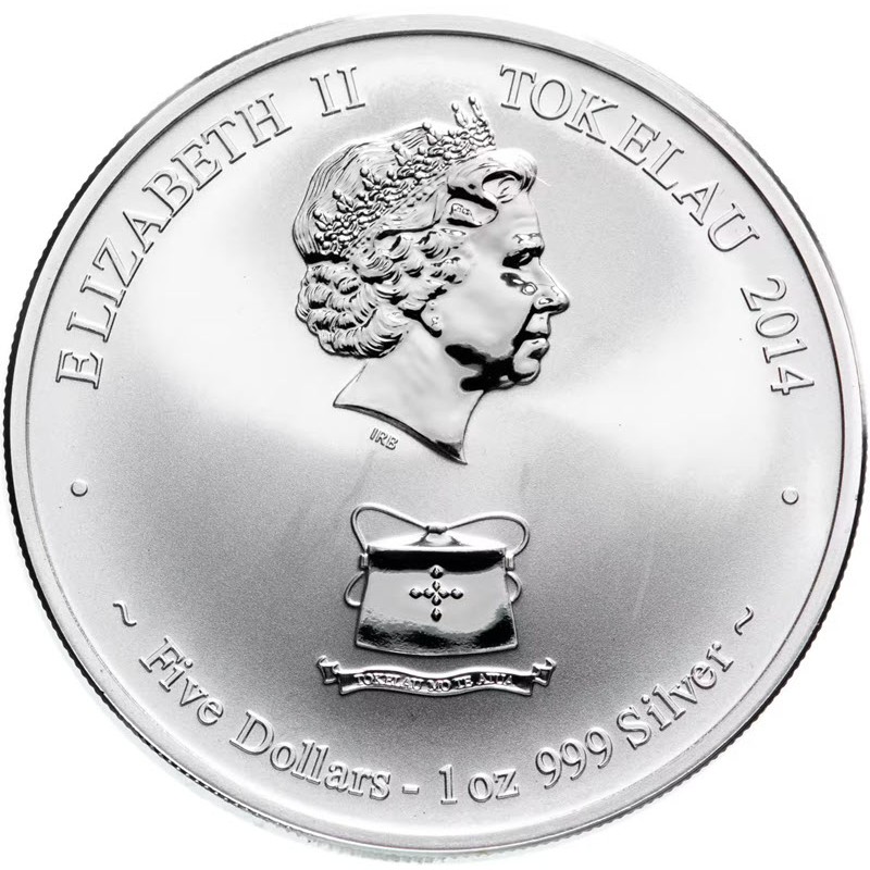 На аверсе вверху изображена Ее Величество королева Елизавета II в бриллиантовой тиаре. Под портретом инициалы дизайнера IRB (Ian Rank Broadley). Ниже герб Токелау - рыбачья сумка (тулума) с надписью: Tokelau mot e Atua (Токелау для Бога). Вдоль канта надпись: • ELIZABETH II TOKELAU 2014 • ~ Five Dollars - 1 oz 999 Fine Silver ~ (Елизавета II, страна-эмитент, год чеканки, номинал, вес и проба серебра).