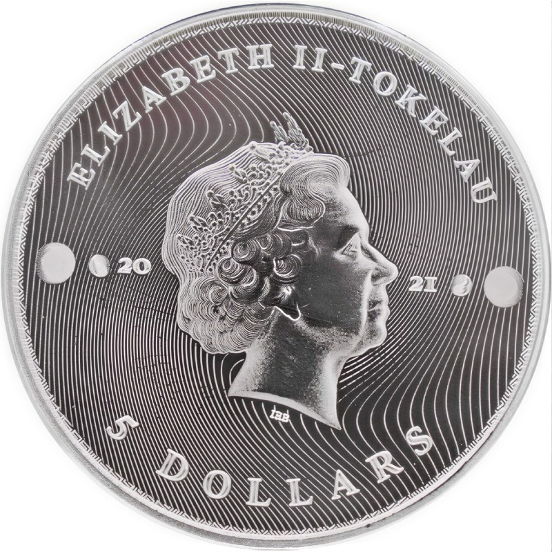 В центре на фоне волнообразных линий изображен портрет Её Величества Королевы Елизаветы II дизайнера Яна Рэнка-Бродли (IRB). Около портрета - 2021 - год чеканки. Вверху вдоль канта надпись: ELIZABETH II – TOKELAU (Елизавета II, страна-эмитент), внизу: 5 DOLLARS (номинал).