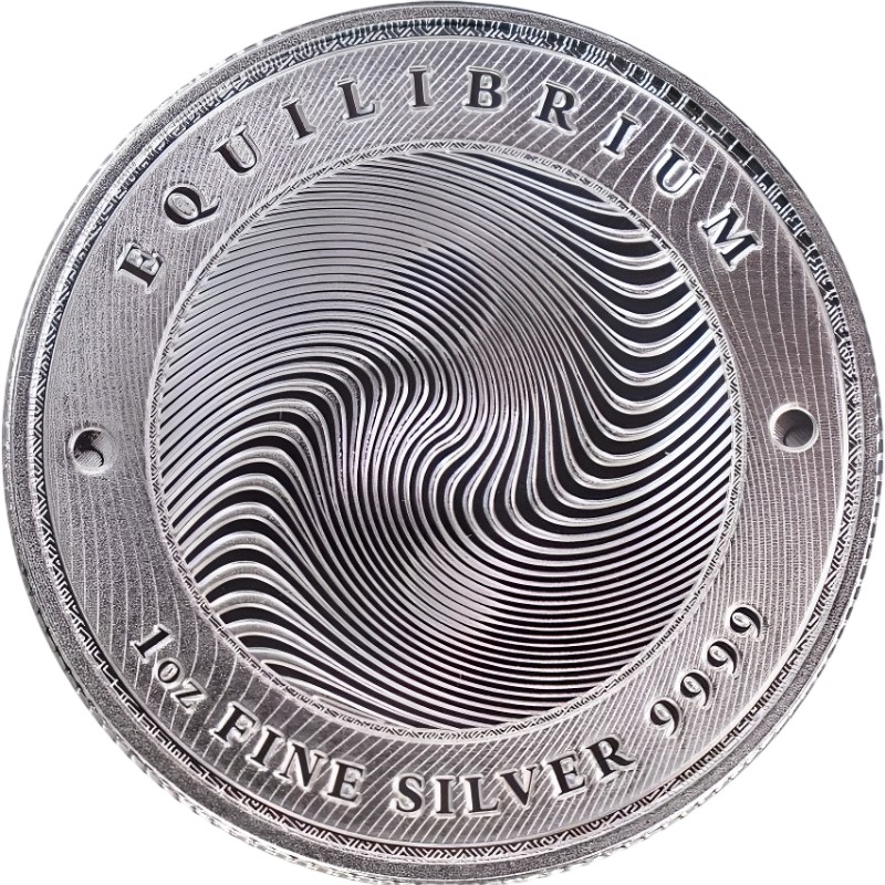 В центре расположен стилизованный символ инь-ян, выполненный с использованием оптической иллюзии из чередующихся матовых и полированных волнистых линий. Вверху вдоль канта надпись: EQUILIBRIUM (равновесие), внизу — 1 oz FINE SILVER 9999 (вес и проба серебра).