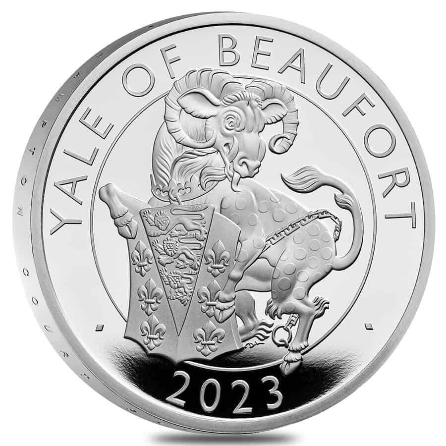 Дизайн, созданный Дэвидом Лоуренсом, изображает мифического йеля, держащего в лапах герб Англии. По ободу название монеты — Yale of Beaufort, и год выпуска — 2023