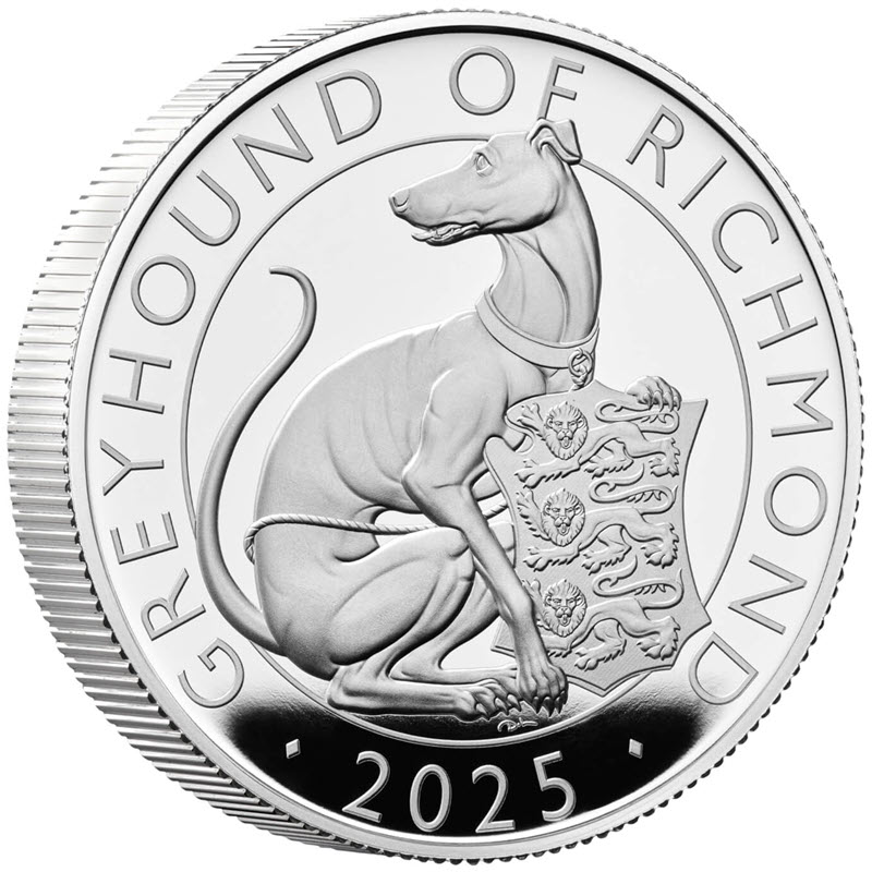 На реверсе изображена сидящая борзая, положившая лапу на щит с тремя львами Англии. У щита в верхнем углу выемка, куда упиралось копьё для атаки в рыцарских турнирах. Вдоль канта надпись: GREYHOUND OF RICHMOND · 2025 · (Грейхаунд Ричмонда, год чеканки). Внизу над датой инициалы дизайнера D.L (David Lawrence).