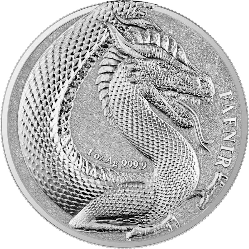 На реверсе - извивающаяся фигура дракона Фафнира с детальной чешуей и открытой пастью. Около дракона в центре надпись: 1 oz Ag 999.9 (вес и проба серебра). Справа - FAFNIR (Фафнир).