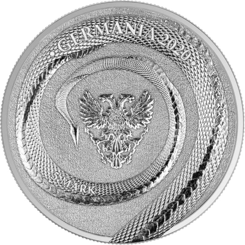 На аверсе – продолжение тела дракона, извивающегося вокруг стилизованного герба Германии – двуглавого орла. На теле дракона надписи: ∙ GERMANIA 2020 ∙ 5 MARK (страна-эмитент, год чеканки, номинал).