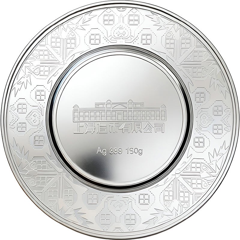 На аверсе изображено здание Шанхайского монетного двора. Внизу надпись: Ag 999 150 g (вес и проба серебра). Вдоль канта узоры народа Цян.