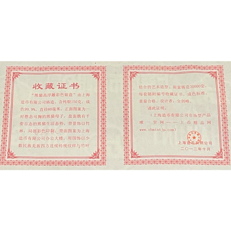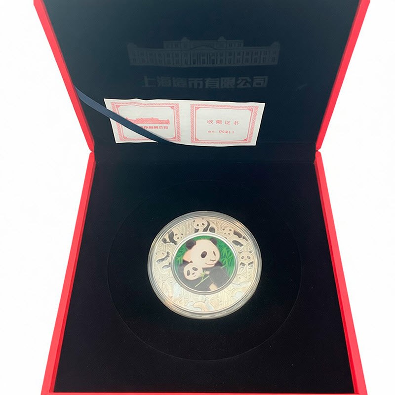 Серебряный жетон «Панда» 2012 года от Народного банка Китая отчеканен Шанхайским монетным двором. У нее высокий рельеф и селективная окраска. Поставляется в оригинальном футляре с сертификатом подлинности. Тираж: 30000 штук.