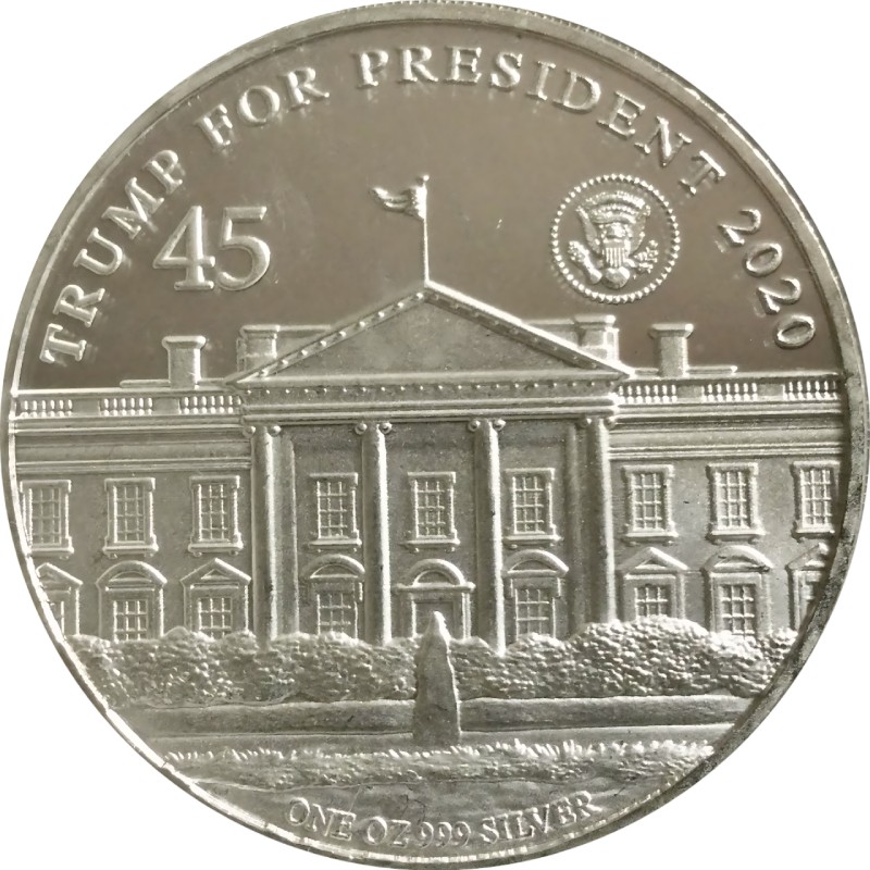На аверсе монеты изображен Белый дом. Над зданием расположен номер "45" и печать президента США. Вверху полукругом надпись: TRUMP FOR PRESIDENT 2020 (Трамп — кандидат в президенты 2020). Внизу: ONE OZ 999 SILVER (вес и проба серебра).