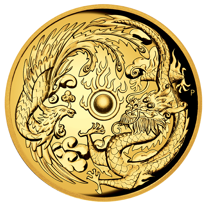 Золотая монета Австралии «Дракон и Феникс» 2017 года выпуска посвящена двум существам, считающимся символами власти, а также мужского (дракон) и женского (феникс). Монета отчеканена в Пертском монетном дворе и выполнена в высоком рельефе. Ограниченный тираж.