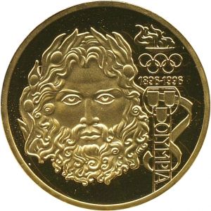 На реверсе изображен бог Зевс, олимпийская символика, огонь, а также обозначение 100-летнего периода (1896-1996).