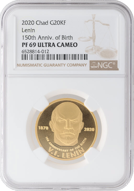 Золотая монета Чада посвяще150-летию В. И. Ленина, крупного теоретика марксизма, советского политического и государственного деятеля, создателя Российской социал-демократической рабочей партии (большевиков), главного организатора и руководителя Великой Октябрьской Социалистической революции 1917 года в России, первого председателя Совета Народных Комиссаров (правительства) РСФСР, создателя первого в мировой истории социалистического государства. Марксиста, публициста, основоположника марксизма-ленинизма, идеолога и создателя Третьего (Коммунистического) интернационала, основателя СССР, первого председателя СНК СССР. Тираж: 50 штук.