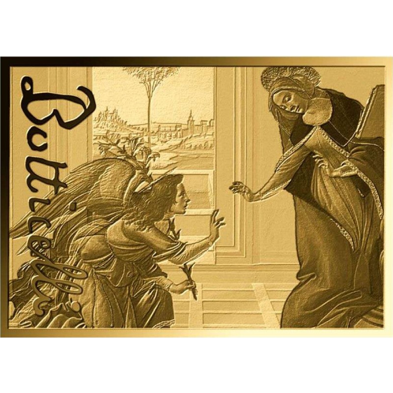 Эта потрясающая золотая монета весом 1/1000 унции посвящена картинам Сандро Боттичелли. У нее размеры 11 Х 15.4 мм и качество пруф-лайк. Поставляется в карточке с сертификатом подлинности. Тираж: 50 000 штук.