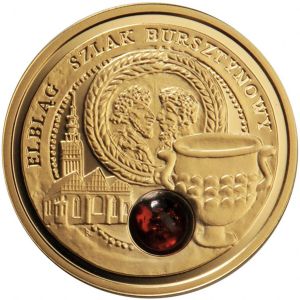 На реверсе сверху, вдоль края – надписи на польском языке: ELBLĄG (название польского города – пункт Янтарного пути) и SZLAK BURSZTYNOWY (Янтарный путь). В центре – стилизованное изображение римского медальона, выкопанного около города Эльблонг, изображающего лица двух римских императоров: Марка Аврелия и Луция Вера. Внизу, справа – стилизованное изображение глиняного кувшина, датированного с римских времен, который был найден во время археологических раскопок около Эльблонга. Слева – стилизованное изображение Собора Святого Николая – самого примечательного здания г. Эльблонга. В основании – янтарная вставка.