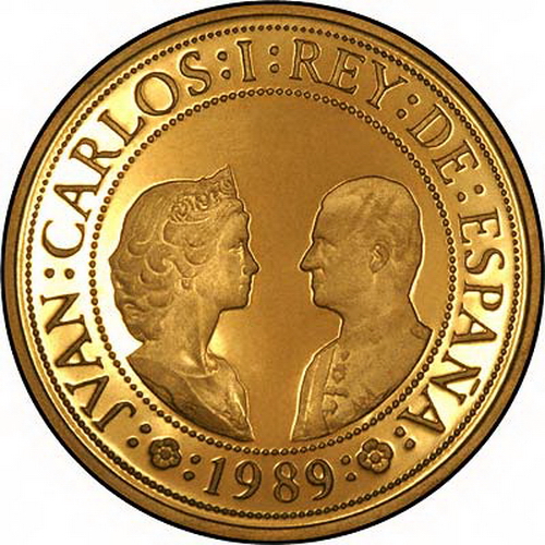На аверсе внутри круга из точек изображены портреты короля Хуана Карлоса I (справа) (с 1975 по 2014 гг.) и королевы Софии, обращенные друг к другу. По ободу кругом стоят следующие надписи: «JUAN CARLOS I REY DE ESPANA 1989» (Хуан Карлос I король Испании, год выпуска монеты – 1989).
