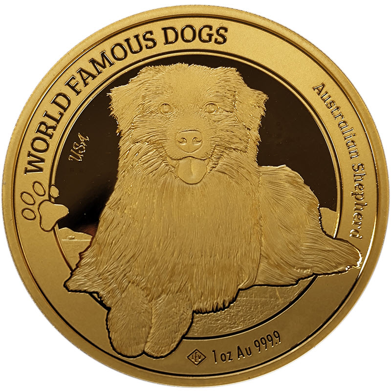 На реверсе изображена овчарка, смотрящая на зрителя. Слева стилизованная собачья лапа. Над лапой надпись: USA (страна происхождения). Вдоль канта надпись: WORLD FAMOUS DOGS Australian Shepherd 1 oz Au 999.9 (серия, австралийская овчарка, вес и проба золота). Внизу: LEV (монограмма монетного двора).