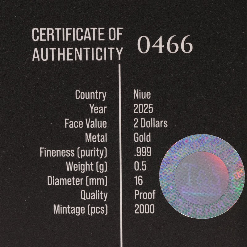 На аверсе монеты изображена неофициальная «Государственная печать Ниуэ». Это композиция из растений в центре внутри двойного декоративного круга, окруженного морскими раковинами. Он увенчан короной Святого Эдуарда (символом Соединенного Королевства, монарх которого в конечном итоге является главой государства Ниуэ). Сверху между ними надпись PUBLIC SEAL OF NIUE. Ниже на ленте в две строки изображен девиз ATUA NIUE TUKULAGI, ниже которых две перекрещенные катуа. Вдоль канта надпись: MICHAEL Au 999 0,5g TS 2025 2 DOLLARS (название монеты, вес и проба золота, монограмма монетного двора, год чеканки, номинал).