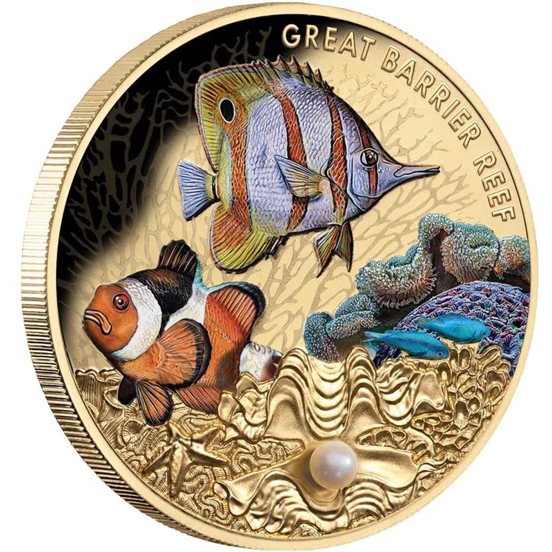 Изображение морского дна с обитателями рифа. По ободу надпись — Great Barrier Reef.