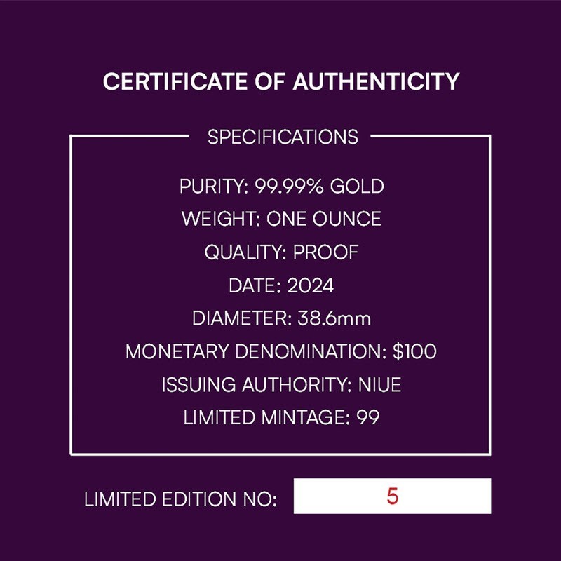 На аверсе монеты изображен Его Величество король Чарльз III. На усечении шеи инициалы дизайнера JC (Jody Clark). Вдоль канта надписи: CHARLES III • NIUE 2024 • 100 DOLLARS • 1 oz 9999 GOLD • (Чарльз III, страна-эмитент, год чеканки, номинал, вес и проба золота).