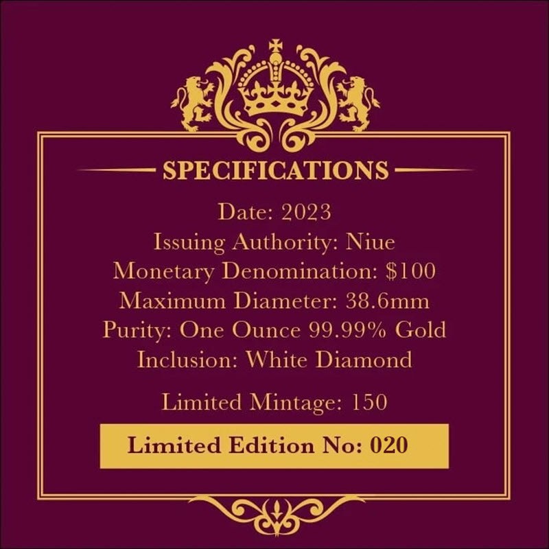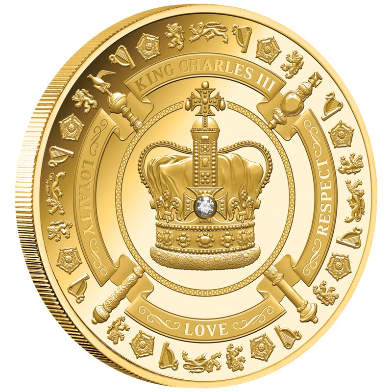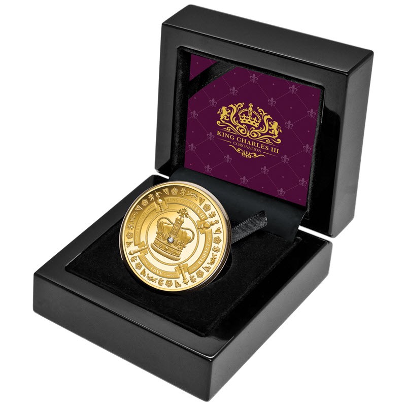 Эта удивительная золотая монета весом в 1 унцию посвящена исторической коронации короля Карла III. У нее качество пруф, прекрасная бриллиантовая вставка и элегантный дизайн. Поставляется в оригинальном футляре с сертификатом подлинности. Тираж: 150 штук.