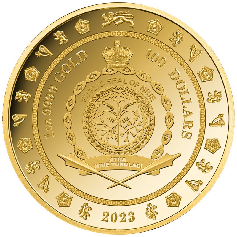 На аверсе монеты изображена неофициальная «Государственная печать Ниуэ». Это  композиция из растений в центре внутри двойного декоративного круга, окруженного морскими раковинами. Он увенчан короной Святого Эдуарда (символом Соединенного Королевства, монарх которого в конечном итоге является главой государства Ниуэ). Сверху между ними надпись PUBLIC SEAL OF NIUE (ПУБЛИЧНАЯ ПЕЧАТЬ НИУЭ). Ниже на ленте в две строки изображен девиз ATUA NIUE TUKULAGI (Бог, Ниуэ навсегда), ниже которых две перекрещенные катуа. Вокруг печати надпись: 1oz 9999 GOLD 100 DOLLARS (вес и проба золота, номинал). Вдоль канта символы британской монархии: роза Тюдоров, лев Англии, арфа Ирландии и лев Шотландии. Внизу: 2023 (год чеканки).