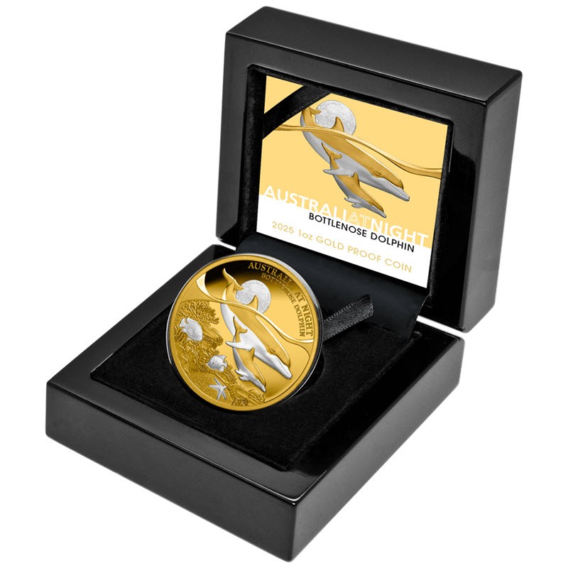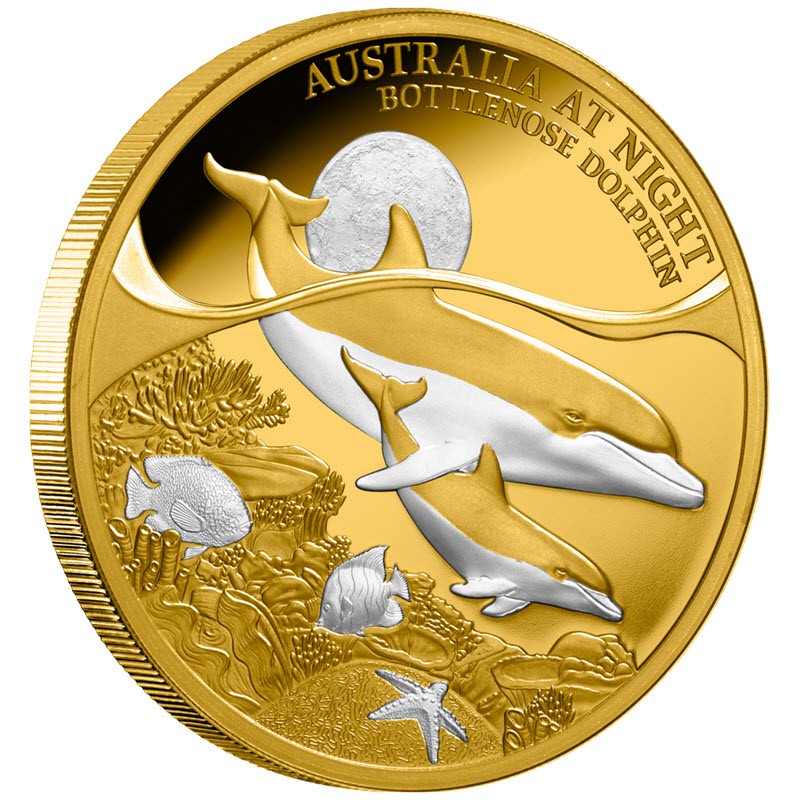 На реверсе изображены мама дельфина с детенышем на фоне кораллового рифа. Луна, дельфины и рыбы имеют платиновое покрытие. Вверху, в две строки надпись: AUSTRALIA AT NIGHT BOTTLENOSE DOLPHIN.