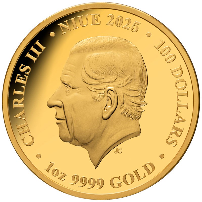 На аверсе изображен Его величество Король Чарльз III. Под портретом инициалы дизайнера JC (Jody Clark). Вдоль канта надпись: CHARLES III · NIUE 2025 · 100 DOLLARS · 1oz 9999 GOLD · (Чарльз III, страна-эмитент, год чеканки, номинал, вес и проба золота).