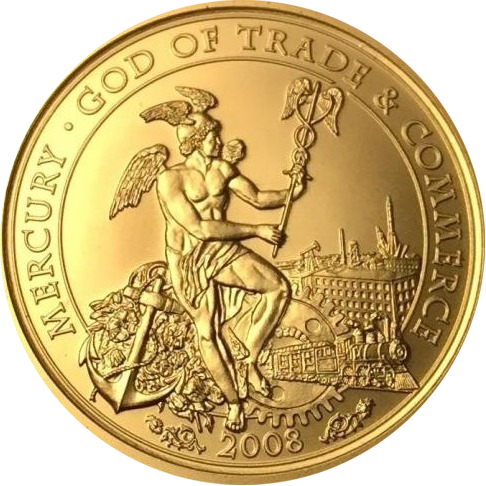 Золотая монета Островов Кука, посвященная древнеримскому богу торговли, Меркурию.