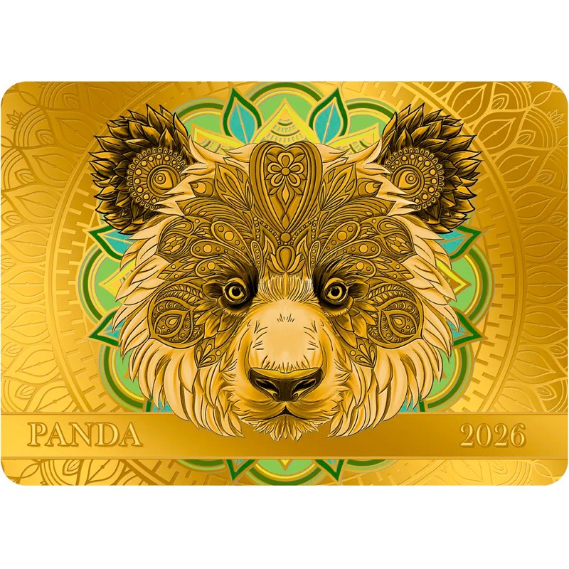Эта чудесная золотая монета весом 1/200 унции прямоугольной формы с цветным изображением панды в стиле мандалы.