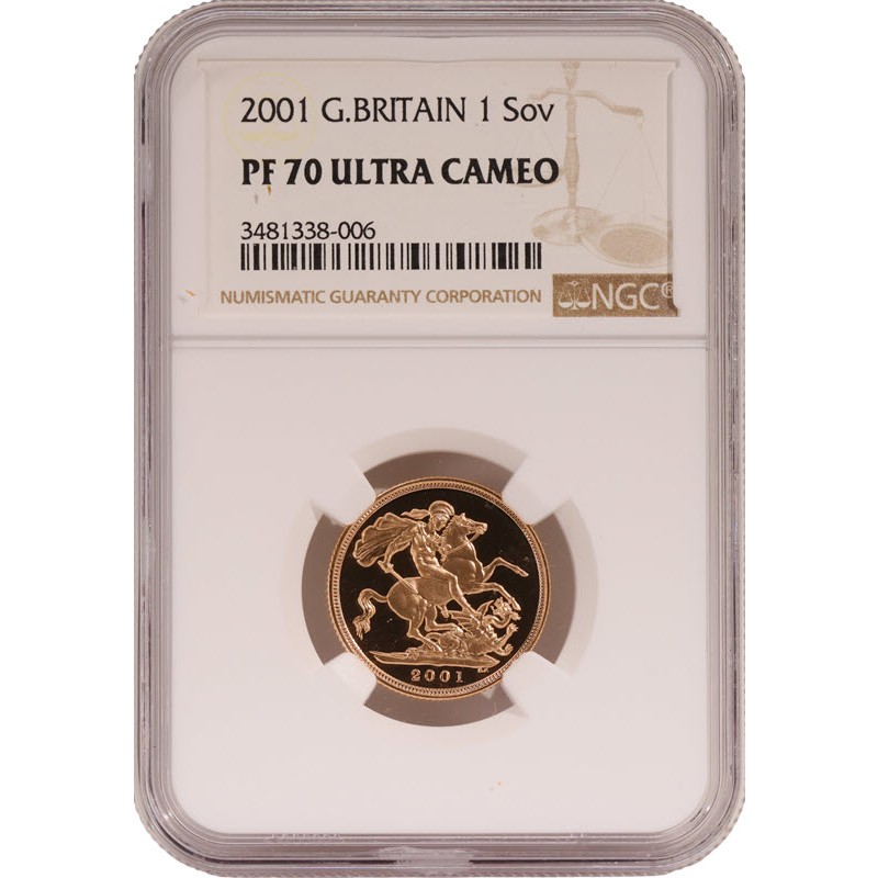 2001 год – Великобритания 1соверен. Пруф. Тираж: 10806 штук.