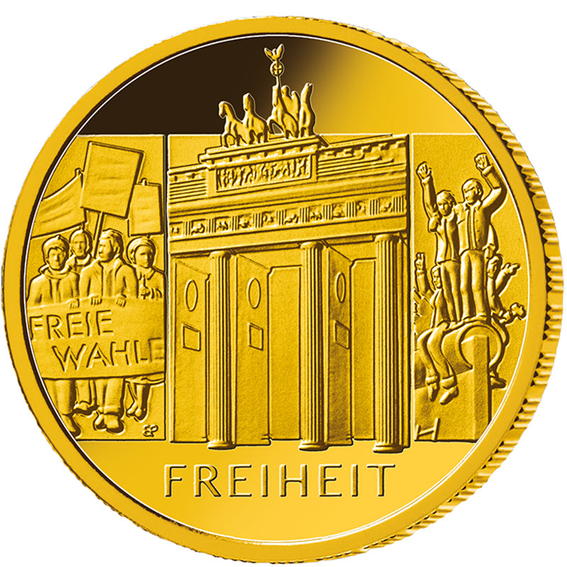 Третий и последний выпуск серии немецких золотых монет «Свобода» весом в полунции золота и номиналом 100 евро посвящена девизу «Столпы демократии — единство, справедливость и свобода». Это центральные концепции немецкой демократии. Они закреплены в Основном законе и присутствуют в государственном гимне: единство, справедливость и свобода. Бранденбургские ворота в Берлине, которые не только считаются одной из важнейших достопримечательностей немецкой столицы, но и представляют Германию во всем мире. Обладая символической силой, Бранденбургские ворота символизируют преодоление разделения Германии и свободу.