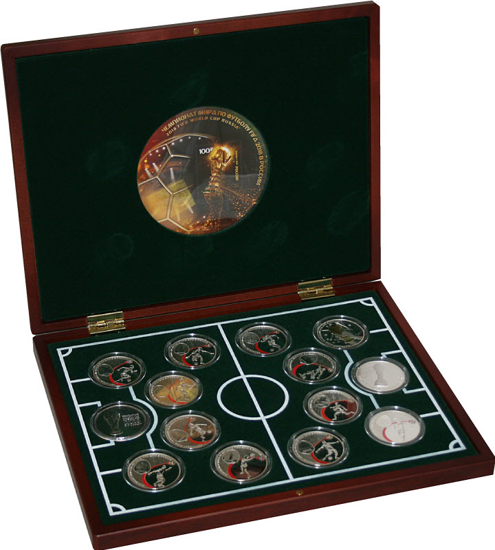Набор посвящен чемпионату мира по футболу 2018 года в России. В набор входят 14 серебряных монет весом в 1 унция каждая:
