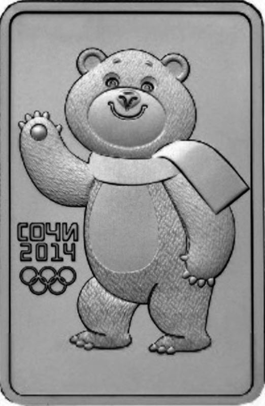 Реверс: рельефное изображение Белого Мишки - официального талисмана XXII Олимпийских зимних игр 2014 года в г. Сочи, слева от него в две строки - надпись: "СОЧИ" и дата: "2014", под ними - пять Олимпийских колец.