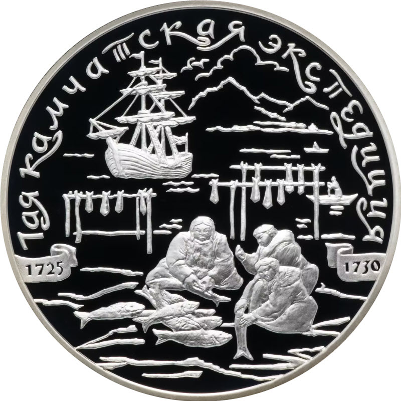 изображения камчадалов, обрабатывающих рыбу, слева и справа от них на ленте - даты "1725" "1730", на втором плане слева - парусное судно, справа - рыбак в лодке, на горизонте - очертания гор, облака, по окружности - надпись: "1ая КАМЧАТСКАЯ ЭКСПЕДИЦИЯ".