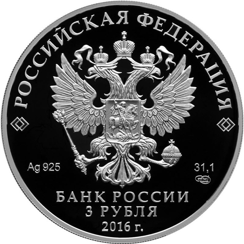 На аверсе в центре — рельефное изображение Государственного герба Российской Федерации, вверху вдоль канта надпись: РОССИЙСКАЯ ФЕДЕРАЦИЯ, обрамленная с обеих сторон сдвоенными ромбами, внизу под гербом надпись: Ag 925 31,1 СПМД (вес и проба серебра, монограмма монетного двора), ниже надпись в три строки: БАНК РОССИИ 3 РУБЛЯ 2016 г. (банк, номинал, год чеканки).