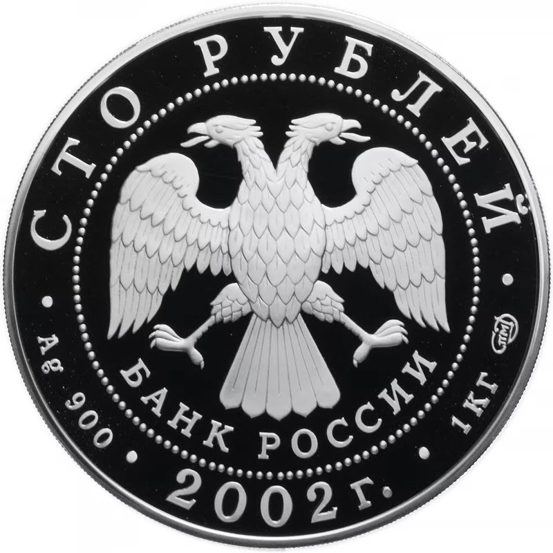 На аверсе изображение двуглавого орла с опущенными крыльями, под ним надпись: БАНК РОССИИ. Вдоль канта надписи: • СТО РУБЛЕЙ • Ag 900 • 2002 г. • 1 КГ СПМД • (номинал, вес и проба серебра, год чеканки и товарный знак монетного двора).