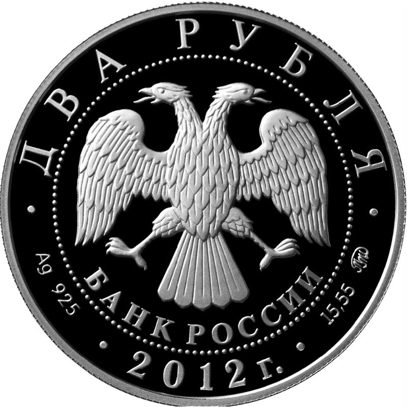 На аверсе изображена эмблема Банка России (двуглавый орёл с опущенными крыльями). Под ним надпись: БАНК РОССИИ. Вдоль канта надпись: ДВА РУБЛЯ • Ag 925 • 2012 г. • 15,55 ММД • (номинал, вес и проба серебра, год чеканки, монограмма московского монетного двора).