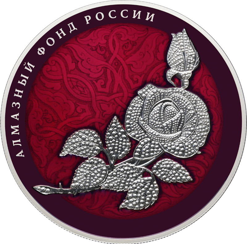 На реверсе изображена брошь «Роза» на фоне древнерусского орнамента в цвете. Вдоль канта надпись: АЛМАЗНЫЙ ФОНД РОССИИ.
