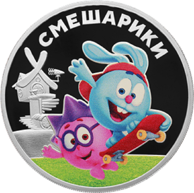 выполненное в цвете изображение героев мультфильма «Смешарики» на фоне рельефного изображения домика одного из героев; вверху по окружности имеется рельефная надпись: «СМЕШАРИКИ».