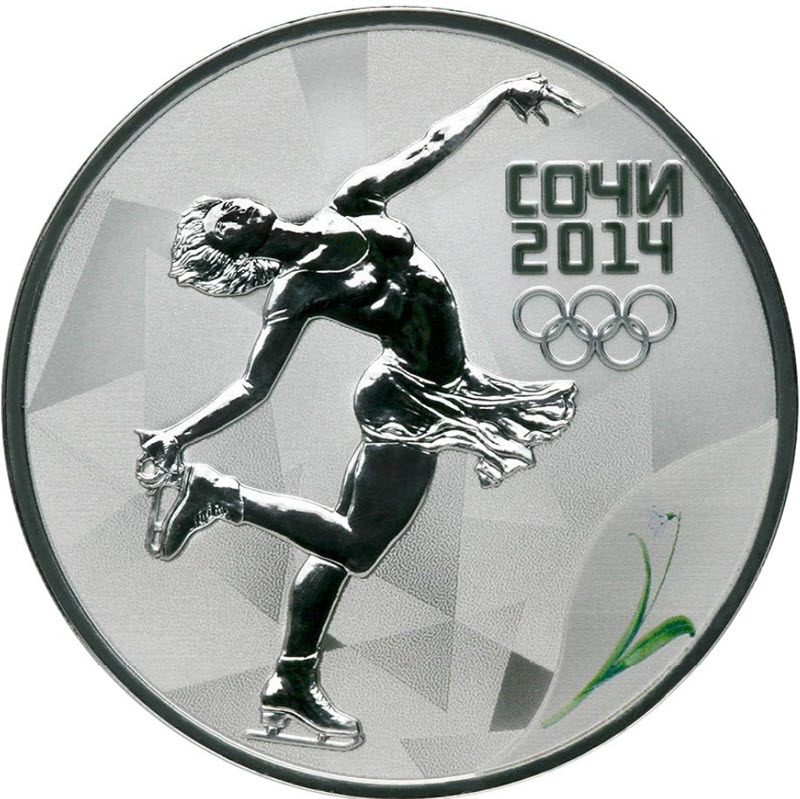 На реверсе изображена фигуристка на льду. Справа надпись: СОЧИ 2014 и пять олимпийских колец. Внизу справа цветное изображение соцветия подснежника Воронова.