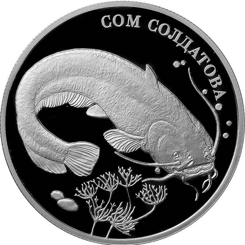 Памятная серебряная монета 2014 г. Банка России из серии «Красная книга» посвящена сому Солдатова. У нее качество пруф. Тираж: 5000 штук.