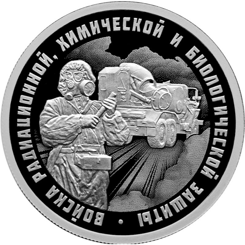 Российская серебряная монета 2026 г. выпуска качества пруф из серии «Вооруженные силы Российской Федерации» посвящена войскам РБХЗ. Тираж: 5000 штук.