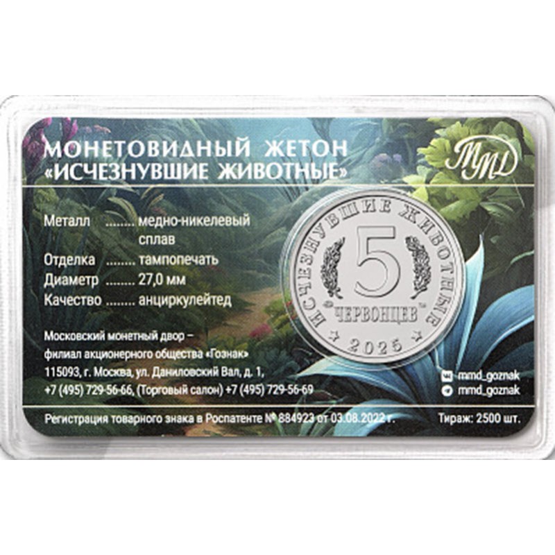 На аверсе указан номинал: 5 ЧЕРВОНЦЕВ. Вдоль канта надпись: ИСЧЕЗНУВШИЕ ЖИВОТНЫЕ ✩ 2025 ✩(серия, год чеканки).
