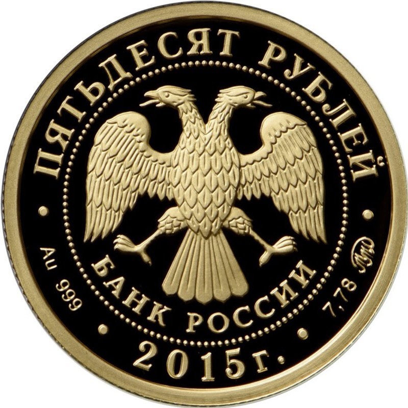 На аверсе изображена эмблема Банка России (двуглавый орёл с опущенными крыльями). Под ним надпись: БАНК РОССИИ. Вдоль канта надпись: ПЯТЬДЕСЯТ РУБЛЕЙ • Au 999 • 2015 г. • 7,78 ММД • (номинал, вес и проба золота, год чеканки, монограмма московского монетного двора).