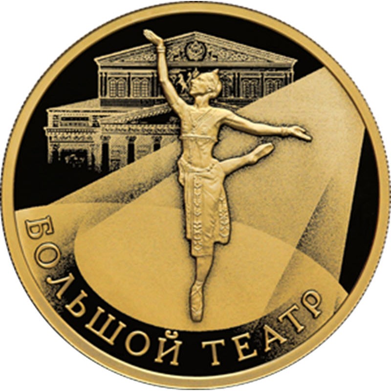 На реверсе изображена танцующая балерина на фоне здания Большого театра и света софитов. Внизу надпись: БОЛЬШОЙ ТЕАТР.