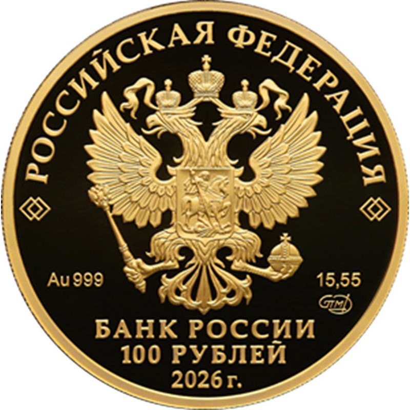 На аверсе изображение Государственного герба Российской Федерации, вверху вдоль канта надпись: РОССИЙСКАЯ ФЕДЕРАЦИЯ, обрамленная с обеих сторон сдвоенными ромбами, внизу под гербом: Au 999 15,55 СПМД (вес и проба золота, монограмма монетного двора), внизу надпись в три строки: БАНК РОССИИ 100 РУБЛЕЙ 2026 г. (банк, номинал, год чеканки).